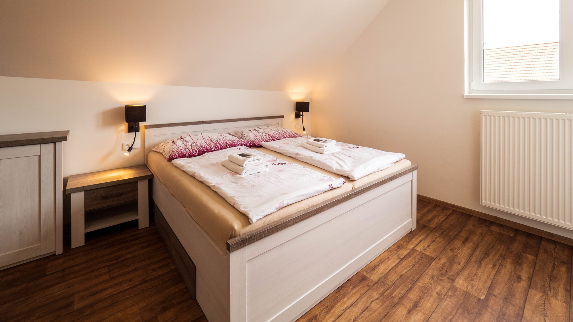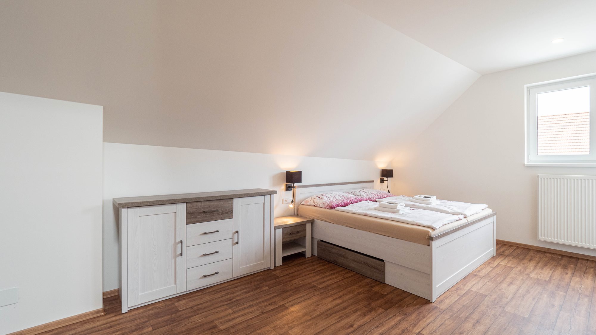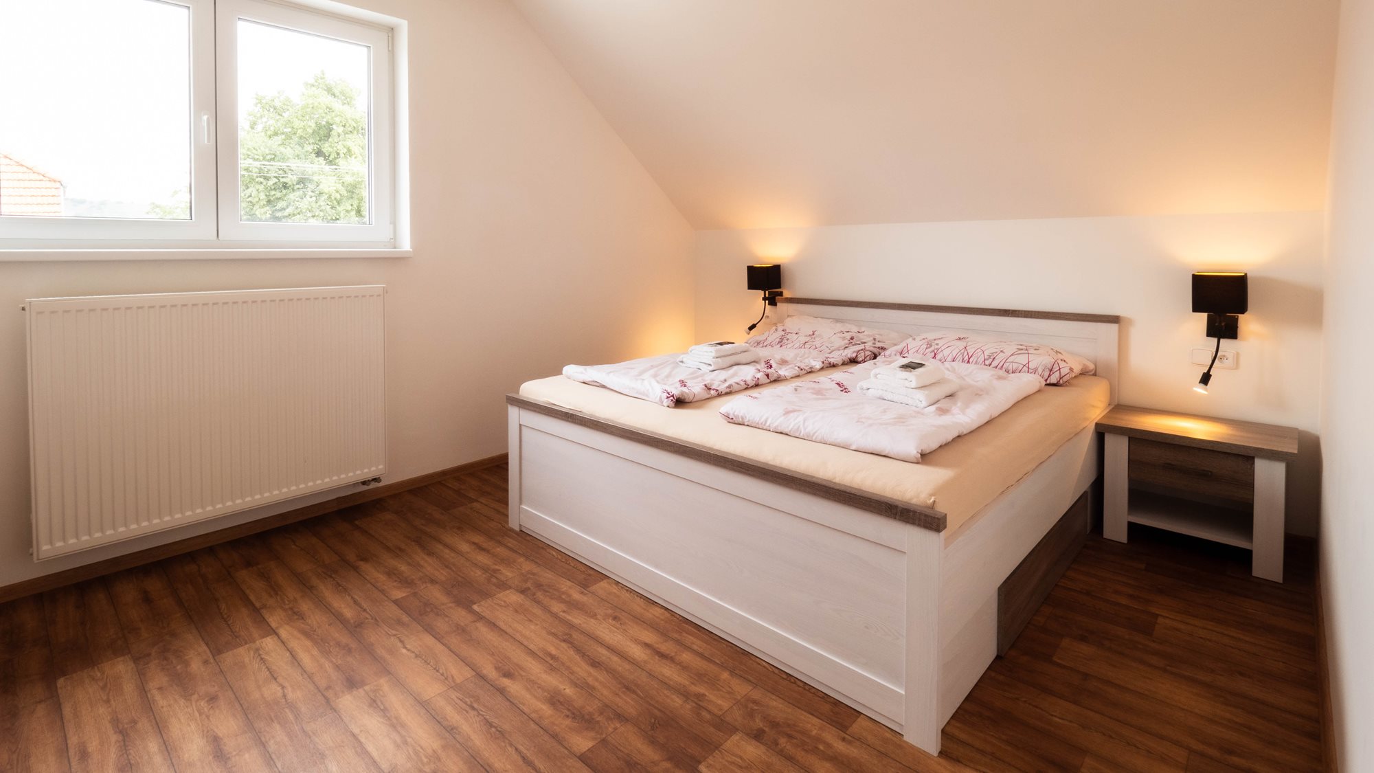 2 klimatizované ložnice, velká koupelna s vanou i sprchovým koutem, 8 lůžek, velký obývací pokoj.